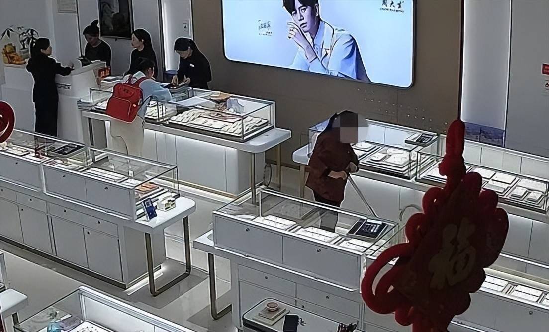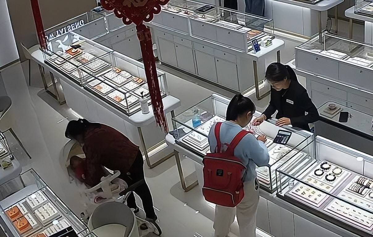 二人进店后那位宝妈表示想看看金戒指营业员便帮忙挑选、试戴而那位年纪大一些的则在一旁照顾孩子不时也会看看款式“年轻一些的确实是想买个戒指,但过了没几分钟,便在那位老年人的催促下离开了。”